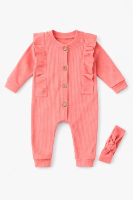 Acest produs Salopeta bebe fetite bumbac rib roz coral cu nasturi si bentita set este model TRAM0039