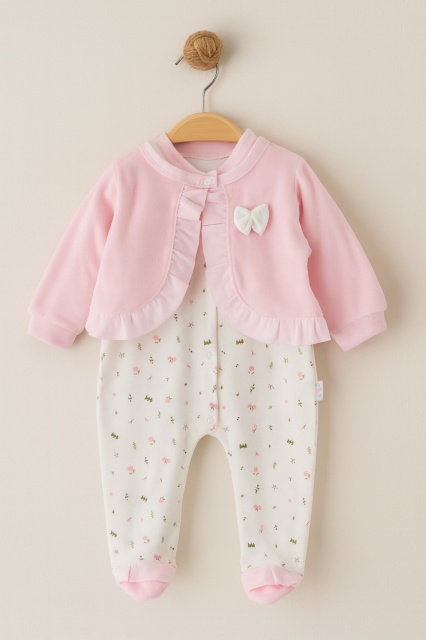 • Salopeta bebelusa roz – model floral, moale si confortabila, cu bolero din catifea trmb4286
