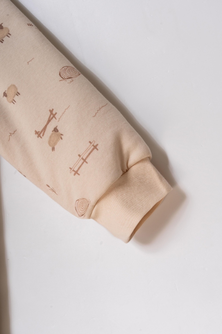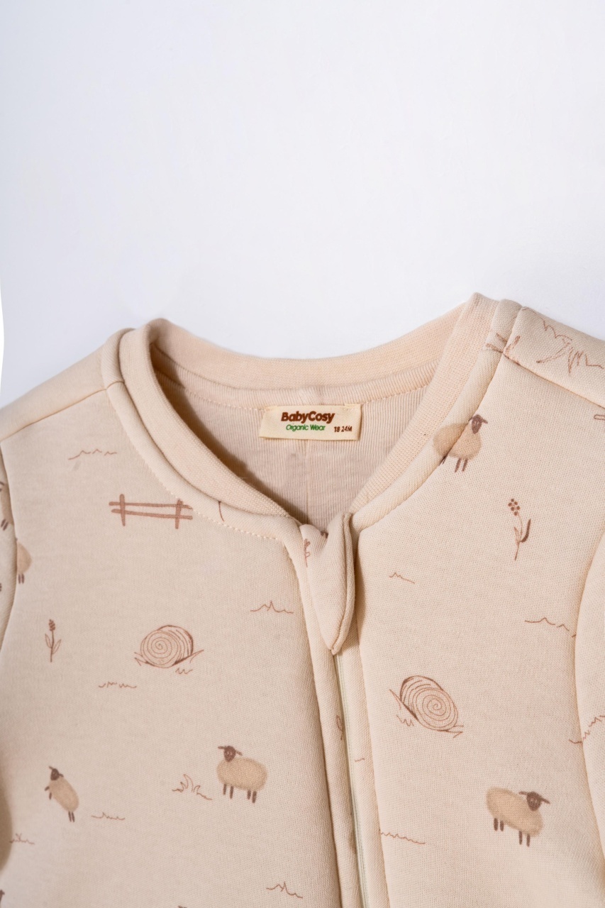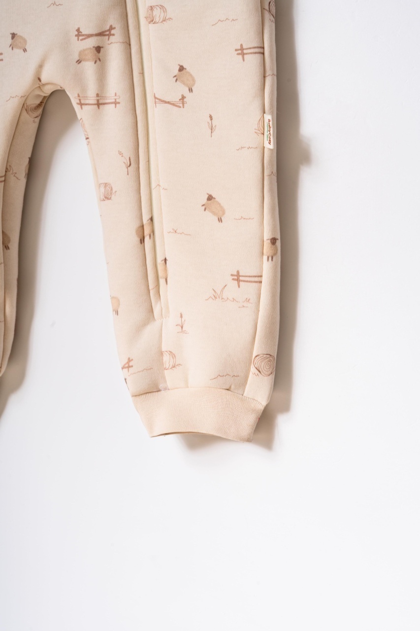 Designul este gândit cu grijă pentru părinți ocupați – fermoarul complet, de sus până jos, permite îmbrăcarea rapidă și schimbarea ușoară a bebelușului, fără disconfort. Imprimeurile delicate cu oițe și tonurile neutre adaugă un aer cald și natural, potrivit atât pentru fetițe, cât și pentru băieței.