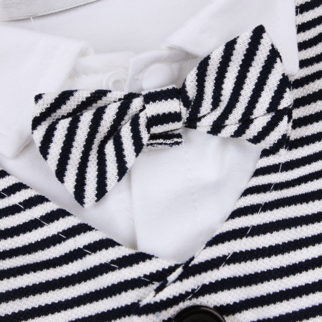 - salopeta bleumarine in partea de jos, alba cu papion si vestuta cu dungulite aplicate in partea de sus. Se inchide cu capse in fata si intre picioruse;