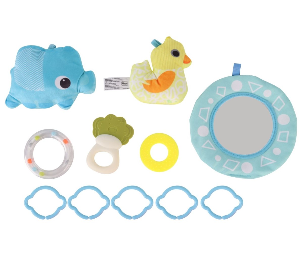- 4 jucarii moi si zornaitoare: Elefant de plus, Ratusca galbena, Zornaitoare transparenta cu bilute, Jucarie de mestecat si 1 inel senzorial