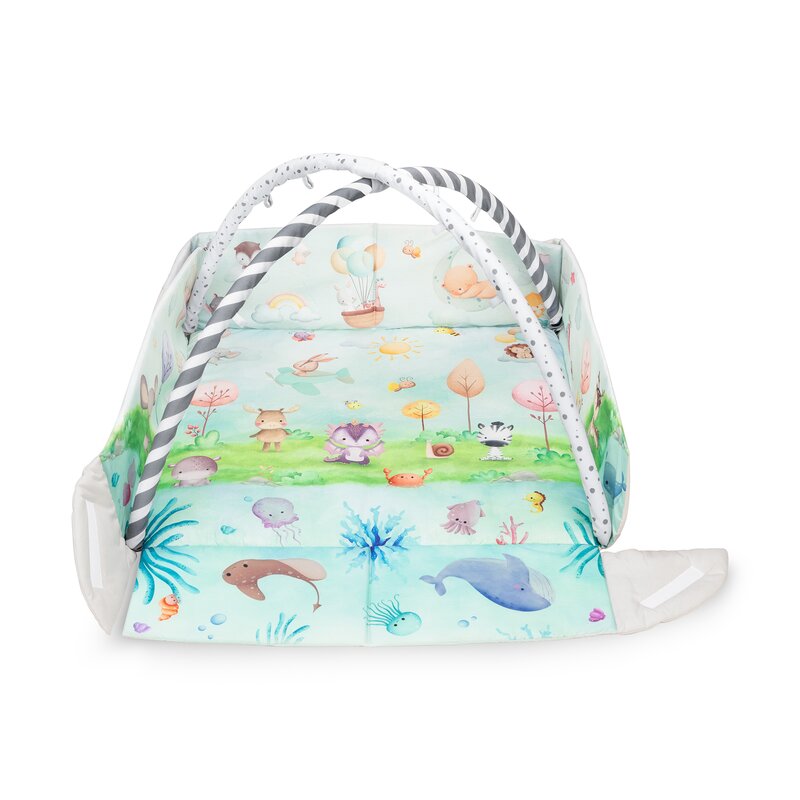Pereții ce se pot ridica ai covorașului formează un spațiu personal și confortabil în care bebelușul se poate juca în siguranță. Este perfect pentru primele încercări de mișcare și explorare independentă.