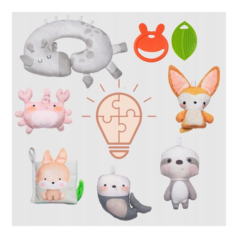 - 8 jucării senzoriale atent selectate pentru dezvoltarea coordonării, explorării și simțurilor.