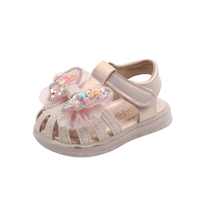 Sandale pentru fetite, din material tip piele ecologica, acoperite cu sclipici, inchise in fata, cu o funda cu paiete aplicata. Se inchid cu bareta cu arici intr-o parte.