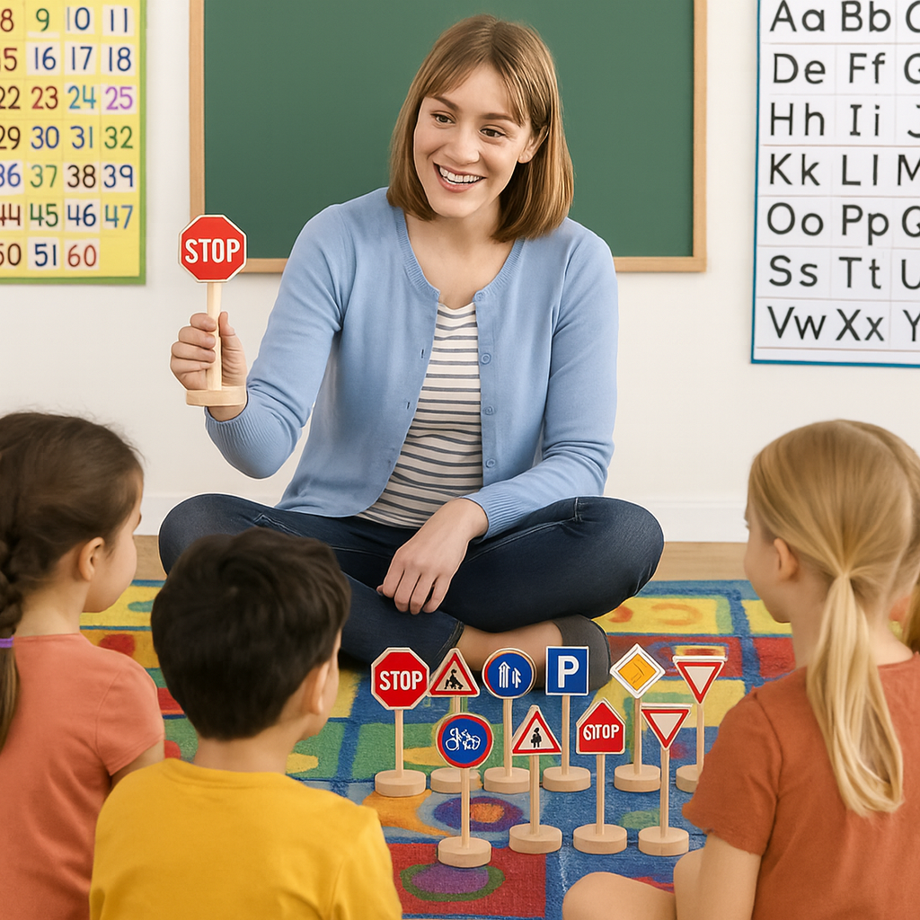 Semne de circulatie pentru copii, de la Goki , set educativ pentru trafic si siguranta rutiera Invata regulile de circulatie intr-un mod practic si placut! Setul Semne de circulatie Goki este un instrument educational ideal pentru scoli, gradinite si centre de activitati , conceput pentru a-i ajuta pe copii (si chiar pe adulti) sa inteleaga semnificatia semnelor rutiere si importanta respectarii regulilor de trafic. Avantaje educative Perfect pentru orele de educatie rutiera , dezvolta spiritul de responsabilitate si atentia la detalii Aplicabil in activitati practice , elevii pot recrea scenarii reale de trafic in clasa sau in spatii special amenajate Claritate vizuala ridicata , semnele sunt mari, colorate si usor de recunoscut Materiale durabile si sigure , potrivite pentru uz frecvent in mediul educational Potrivit pentru toate varstele , de la copiii de varsta prescolara pana la cursurile de formare pentru adulti Setul poate fi folosit la: activitati didactice din cadrul orelor de educatie rutiera, jocuri de rol sau simulari de trafic, ateliere tematice despre siguranta in trafic, activitati extracurriculare din scoli si gradinite. Prin folosirea acestor semne, copiii invata sa recunoasca simbolurile, sa le asocieze cu situatii reale si sa dobandeasca deprinderi de comportament preventiv in trafic. Detalii tehnice Material: lemn Dimensiuni semne: 20 x 13.5 x 5.5 cm Set cu multiple tipuri de semne: interdictii, obligatii, avertizare, indicatoare rutiere Recomandat varsta: 3+ ani Utilizare: interior exterior acoperit Cum se foloseste in activitati educative Amenajarea unor trasee rutiere pe covoare educationale sau planse tematice; Exersarea regulilor de circulatie prin deplasarea mini-vehiculelor conform semnelor; Explicarea functiei fiecarui semn de circulatie si a modului in care contribuie la siguranta rutiera; Organizarea de activitati interactive, precum , žsoferul responsabil, sau , žPietonul atent, , pentru fixarea comportamentelor corecte in trafic. Setul Goki , Semne de circulatie este un suport educativ complet, care transforma invatarea regulilor de trafic intr-o activitate clara, vizuala si eficienta. Comanda acum si ajuta-i pe copii sa inteleaga importanta sigurantei rutiere, inca de la cele mai mici varste.