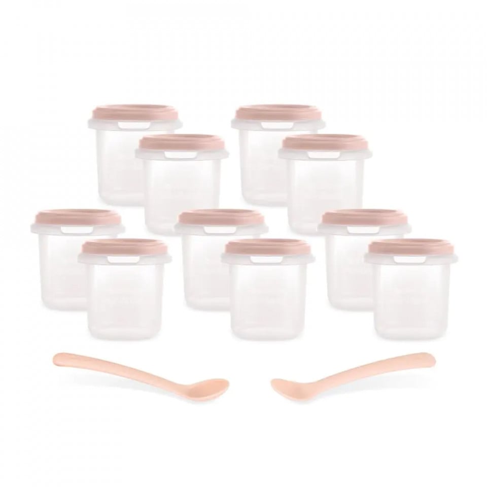 Set de 10 recipiente etanșe de 200 ml, ideale pentru depozitarea alimentelor lichide sau solide ale bebelușului. Le puteți folosi pentru a congela și dezgheța fiecare masă în măsura exactă, deoarece au o scală pe lateral. Foarte convenabile pentru încălzire în același recipient, folosind un încălzitor de biberon, un cuptor cu microunde sau o baie de apă. În plus, acest set include două lingurițe potrivite pentru ca bebelușul dumneavoastră să învețe cum să mănânce.   Mâncărurile bebelușului sunt întotdeauna gata, la munte, la plajă sau în parc! Permite părinților să pregătească mâncarea acasă și să o ia oriunde. Au dimensiunea ideală pentru a fi purtate în geantă, în orice geantă izotermă sau ladă frigorifică.   Fabricat în Spania Recipiente etanșe gradate cu o capacitate de 200 ml, fabricate în Spania cu materiale extrem de rezistente.   Pentru a controla cu precizie hrănirea bebelușului Măsurile din sticlă permit adaptarea dozei la nevoile bebelușului în orice moment. În plus, suprafața laterală permite scrierea cu creionul a unor date precum numele bebelușului, data și tipul de mâncare sau alimentele conținute pentru un control mai mare.   Depozitarea laptelui matern Foarte potrivit pentru depozitarea laptelui matern, fie pentru a-l refrigera și a-l consuma în aceeași zi, fie pentru a-l păstra mai mult timp în congelator.   Pentru toate tipurile de alimente solide sau lichide Ideal pentru terciul de ovăz și toate tipurile de alimente solide, de la aperitive și gustări până la deserturi. Este foarte potrivit pentru alte alimente lichide, cum ar fi ciorbe, consommé-uri sau sucuri naturale. Setul 10 și setul 12 includ, de asemenea, două tipuri de linguri: una mai moale, menită să fie delicată cu gingiile celor mai mici, și una mai adâncă pentru copiii mai mari.   Alimente congelate și decongelate cu toate garanțiile Alimentele pentru bebeluși se păstrează în congelator, menținându-și proprietățile nutriționale, aroma și gustul. Sticla gradată este potrivită pentru cuptoarele cu microunde, ceea ce vă permite să dezghețați alimentele într-o clipă, cu confort și siguranță totală.   Încălziți oriunde Foarte confortabil pentru a încălzi alimentele în același recipient etanș, în orice încălzitor de biberon, la cuptorul cu microunde sau la bain-marie, chiar în momentul administrării.   Fără bisfenol A 100% fără BPA.