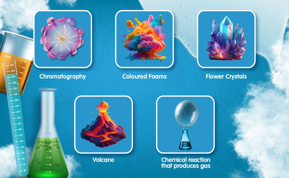 Devino un adevarat om de stiinta cu incredibilul Set 100 Experimente stiintifice! Exploreaza lumea fascinanta a stiintei cu cele 100 de experimente distractive pregatite special pentru tine! Acest set stiintific include 47 de componente si distractie fara sfarsit pentru o luna intreaga! Distreaza-te creand reactii chimice colorate, vulcani, cristale si slime nebunesc. Descopera cromatografia si multe altele! Continutul setului pigment rosu, pigment galben, manusi, vas Petri, ochelari de protectie, benzi pentru pH, pahar gradat mare, minge, eprubete cu capac, palnie, bile de vata, ghiveci, pipete Pasteur, benzi elastice, spatula de plastic, pahare gradate mici, masa de lucru, turba, capac pentru paharele gradate mici, baloane, vulcan, bicarbonat de sodiu, paie, sfoara din lana, fire de modelat, filtre de hartie, betisoare de lemn, spatule din lemn, seminte de fasole verde.
