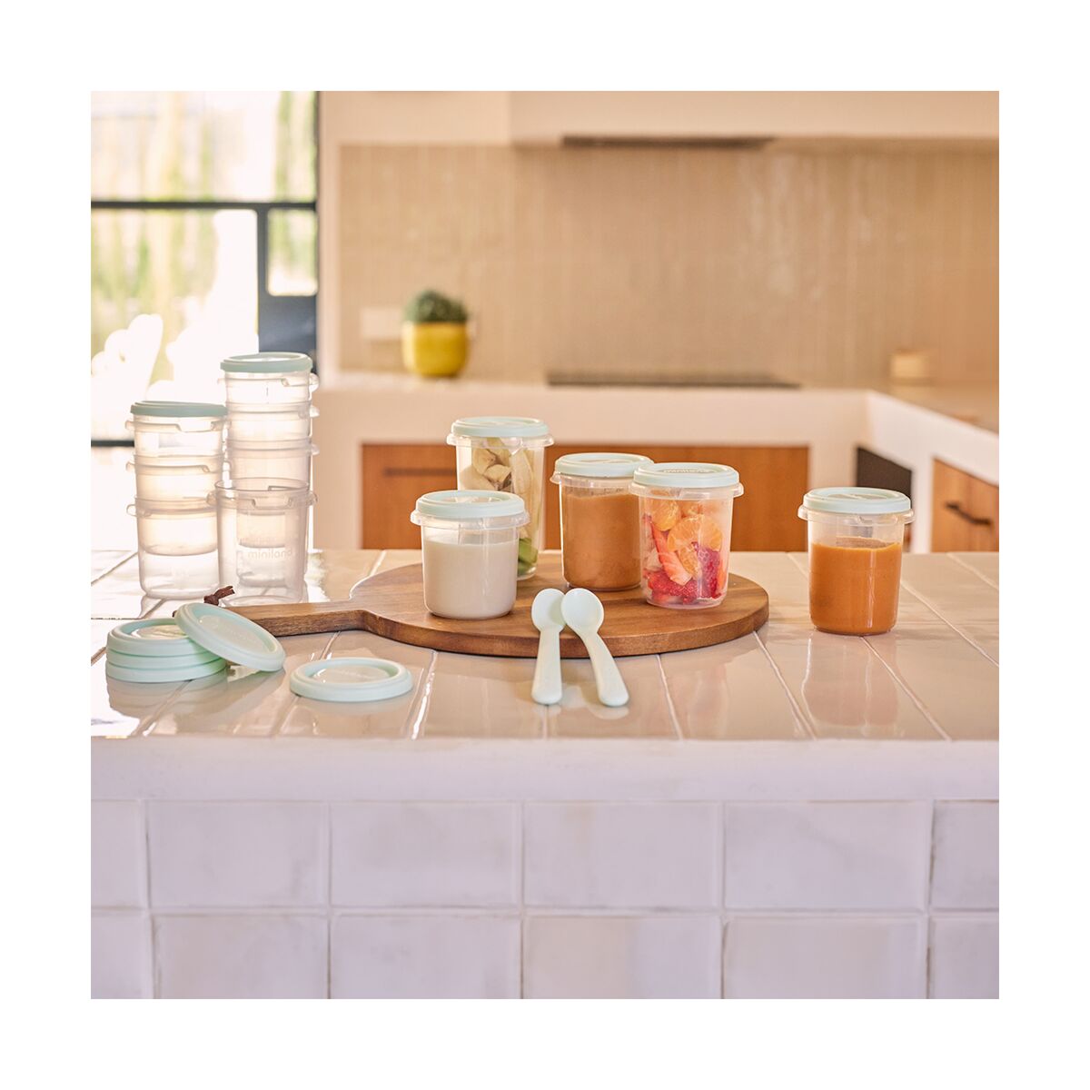 Set de recipiente pentru monitorizarea hrănirii bebelușului. Disponibile în dimensiuni de 200 ml, 250 ml și 330 ml, și în diverse culori. Utile atât pentru alimente solide, cât și lichide. În plus, pentru confortul dumneavoastră, puteți scrie numele fiecărui aliment pe borcane. Congelați-le și bucurați-vă să le luați cu dumneavoastră și să le puteți încălzi oriunde. Mâncărurile bebelușului sunt întotdeauna gata, la munte, la plajă sau în parc! Permite părinților să pregătească mâncarea acasă și să o ia oriunde. Au dimensiunea ideală pentru a fi purtate în geantă, în orice geantă izotermă sau ladă frigorifică. Fabricat în Spania. Recipiente gradate etanșe cu o capacitate de 200 ml, 250 ml și 330 ml, fabricate în Spania cu materiale extrem de rezistente. Pentru a controla cu precizie hrănirea bebelușului. Măsurile din sticlă permit adaptarea dozei la nevoile bebelușului în orice moment. În plus, suprafața laterală permite scrierea cu creionul a unor date precum numele bebelușului, data și tipul de hrană sau alimentele conținute, pentru un control mai mare.   Păstrarea laptelui maternFoarte potrivit pentru depozitarea laptelui matern, fie pentru a-l refrigera și a-l consuma în aceeași zi, fie pentru a-l păstra mai mult timp în congelator.   Pentru toate tipurile de alimente solide sau lichideIdeal pentru terciul de ovăz și toate tipurile de alimente solide, de la aperitive și gustări până la deserturi. Este foarte potrivit pentru alte alimente lichide, cum ar fi ciorbe, consommé-uri sau sucuri naturale. Setul 10 și setul 12 includ, de asemenea, două tipuri de linguri: una mai moale, menită să fie delicată cu gingiile celor mai mici, și una mai adâncă pentru copiii mai mari.   Alimente congelate și decongelate cu toate garanțiileAlimentele pentru bebeluși se păstrează în congelator, menținându-și proprietățile nutriționale, aroma și gustul. Sticla gradată este potrivită pentru cuptoarele cu microunde, ceea ce vă permite să dezghețați alimentele într-o clipă, cu confort și siguranță totală.   Încălziți oriundeFoarte confortabil pentru a încălzi alimentele în același recipient etanș, în orice încălzitor de biberon, la cuptorul cu microunde sau la bain-marie, chiar în momentul administrării.   Fără bisfenol A 100% fără BPA.