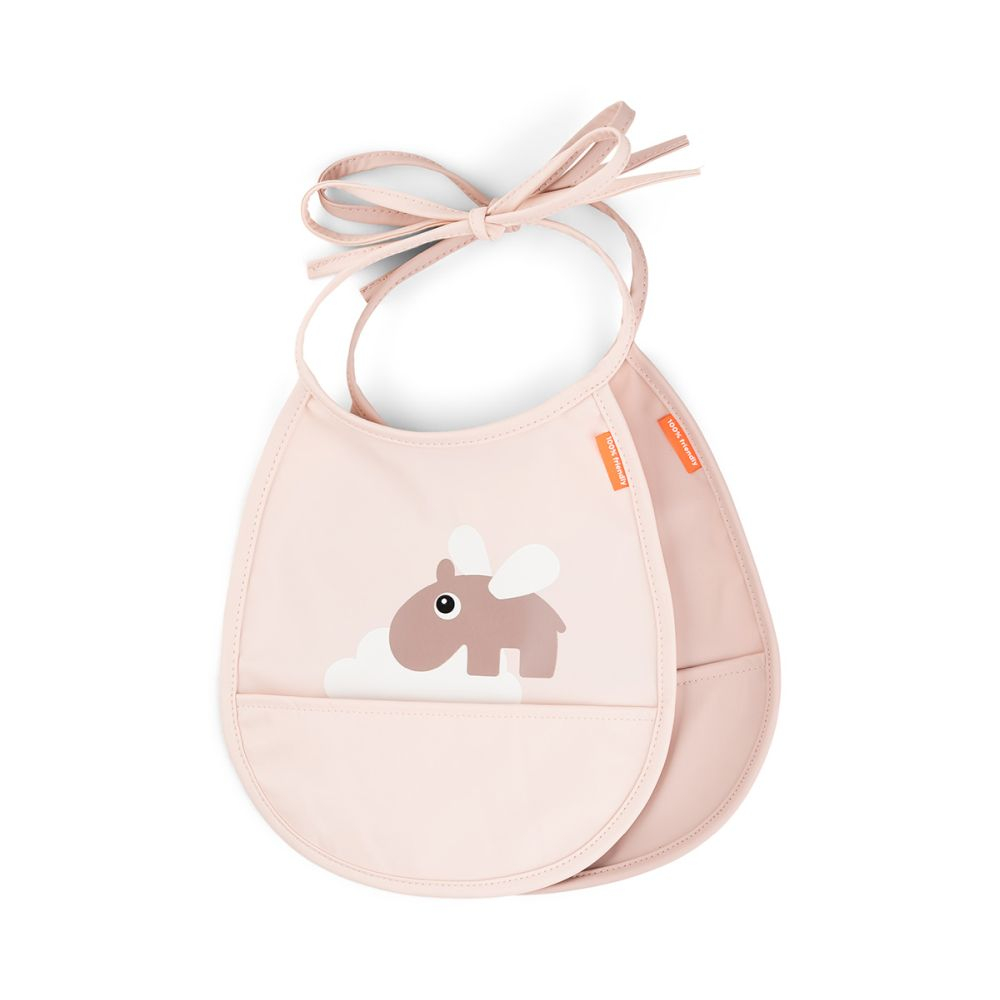 Daca vrei protectie eficienta, curatare rapida si un look jucaus, Set 2 Bavetici cu buzunar Done by Deer Happy Clouds Powder este alegerea potrivita pentru mese fara griji.