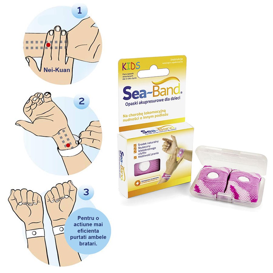 Set 2 bratari de presopunctura Sea-Band, contra starii de greata si raului de masina, pentru copii, Roz Bratarile de presopunctura pentru copii, Sea-Band, stimuleaza punctul P6 (Nei-Kuan) de pe incheietura mainii si reduc eficient greata si starile de rau: migrenele, raul de miscare, etc. Acestea sunt realizate dintr-un material elastic si sunt recomandate pentru copii de peste 3 ani. Presopunctura este o metoda folosita in medicina de mii de ani si datorita eficientei sale ridicate castiga din ce in ce mai multi sustinatori. Caracteristici: - O metoda 100% naturala; - Acceptate de personalul medical si de spitalele din lumea intreaga; - Fabricate in Marea Britanie; - Fara efecte secundare; - Pentru copii de peste 3 ani; - Confortabile si discrete; - Bratari reutilizabile si lavabile; nu isi pierd elasticitatea dupa spalare. Bratari anti-greata - eficacitate confirmata de studii de specialitate S-a dovedit in multe studii ca presiunea constanta asupra punctului P6 contribuie la o reducere semnificativa a gretei si a varsaturilor. Produs in Marea Britanie. Cum se foloseste bratara anti-greata? Bratara se poarta pe incheietura mainii si actioneaza prin apasarea punctului de presopunctura Nei-Kuan de pe fiecare incheietura a bratelor, cu o semisfera de plastic. 1. Pentru a gasi punctul Nei-Kuan intoarceti mana cu palma in sus, puneti 3 degete (aratator, mijlociu, inelar) pe antebrat. 2. Punctul Nei-Kuan se gaseste sub degetul aratator, intre cele doua tendoane ale mainii. Puneti bratara Sea-Band pe incheietura si plasati bila alba pe punctul Nei-Kuan. Pentru ca actiunea bratarilor Sea-Band sa fie eficienta aveti nevoie de cate o bratara pe fiecare incheietura. Bratarile Sea-Band actioneaza in cateva minute, chiar si dupa aparitia starilor de greata. Efectul acestora se termina in momentul in care le scoateti de pe mana. Compozitie: nailon si elastan. Continut pachet: 2 bratari de presopunctura pentru copii.,