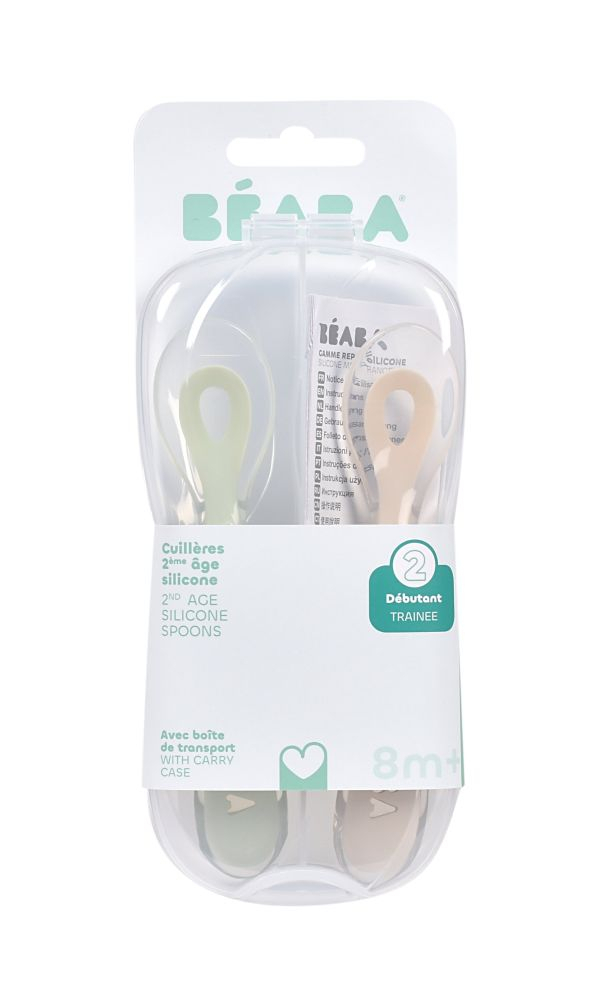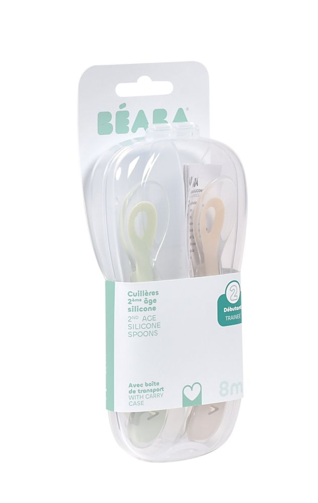 'Set 2 lingurite silicon Beaba +8 luni cu cutie de transport Clay este un set de lingurite de invatare (etapa a doua), creat pentru perioada in care copilul incepe sa manance mai independent. Include doua lingurite din silicon si o cutie de transport, utile atat acasa, cat si la plimbari sau in calatorii.