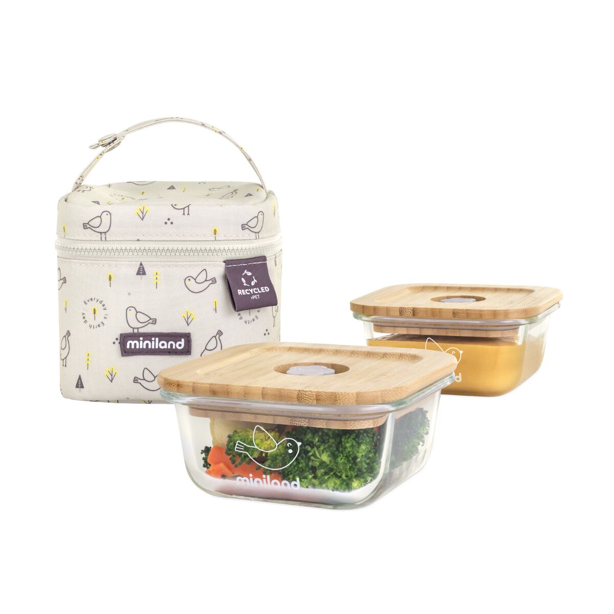 Recipiente din sticlă cu capace din lemn pentru mâncarea celor mai mici membri ai familiei.    Acest set ecologic, ideal pentru depozitarea și transportul mâncării preparate acasă de bebeluș, este compus din două recipiente din sticlă de 210 ml. Sticla este un material rezistent și durabil care, datorită transparenței sale complete, face conținutul perfect vizibil.   Capacul este fabricat din bambus din păduri sustenabile certificate FSC™.    Geantă de transport răcoritoare din material reciclat. Pentru confortul transportului recipientelor peste tot, setul include o geantă de călătorie răcoritoare cu interior izolator pentru a ajuta la o mai bună conservare a alimentelor, fabricată din material textil provenit din plastic reciclat (rPET). Acest material oferă o a doua viață deșeurilor și ne apropie de un viitor mai sustenabil.   Supapă de închidere etanșă Supapa de deschidere și închidere etanșă de pe capac asigură cea mai bună conservare a alimentelor și previne scurgerile nedorite. În plus, sigiliul din silicon face posibilă conservarea aromelor și aromelor. Potrivit pentru cuptoare cu microunde, congelatoare și chiar cuptoare.   Datorită sticlei rezistente la temperaturi extreme și șocuri termice, este potrivit pentru cuptoare cu microunde, congelatoare și chiar pentru încălzirea alimentelor în cuptor.   Ușor de curățat și potrivit pentru mașina de spălat vase. Datorită suprafeței unice a sticlei, aceste recipiente sunt deosebit de ușor de curățat și se pot spăla în mașina de spălat vase. Dimensiuni(cm) 11.5 x 5.5 x 11.5