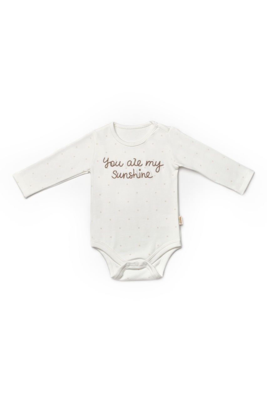 2. Body-ul cu maneci lungi, din 100% bumbac organic, se inchide cu capse intre picioruse si la umar.