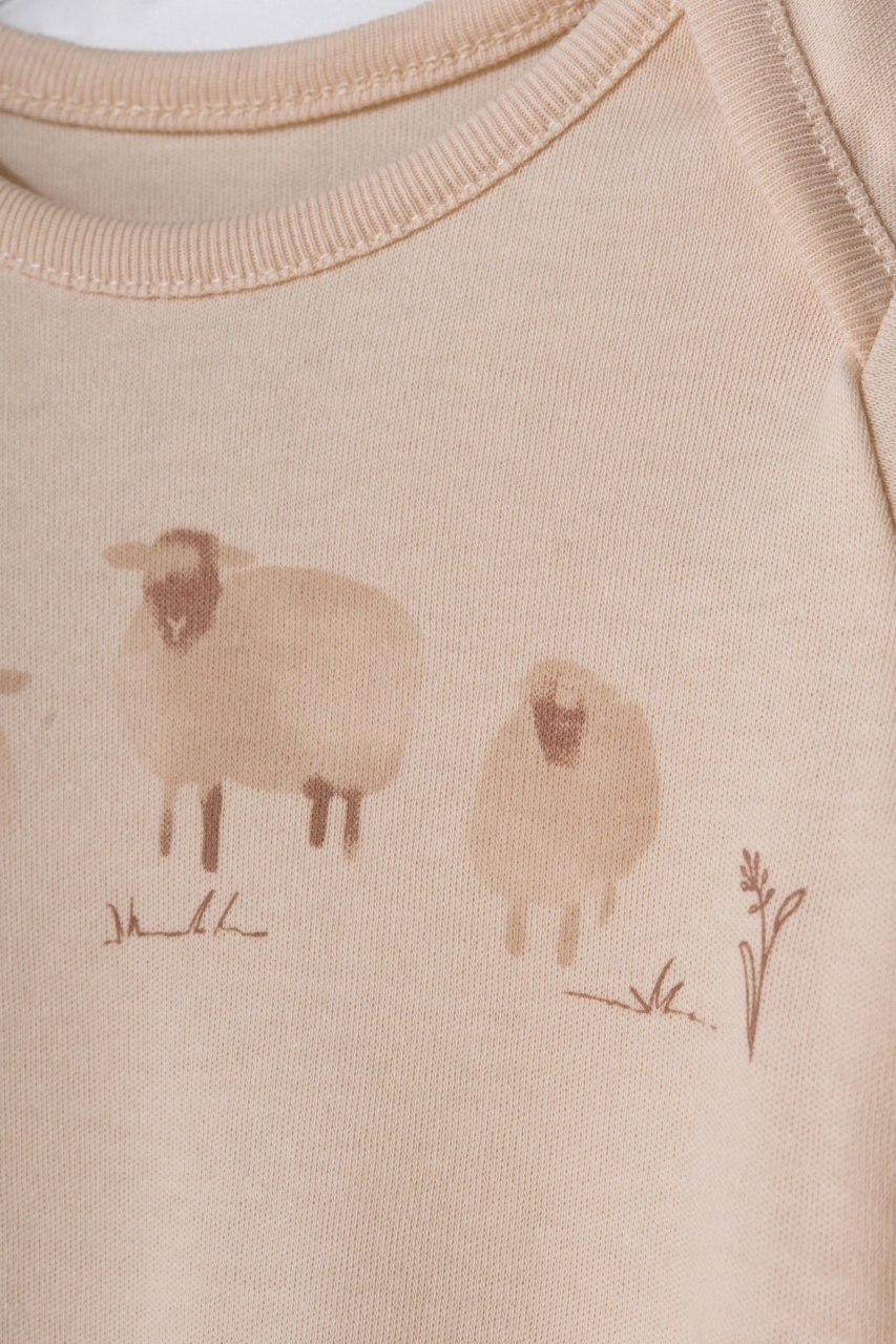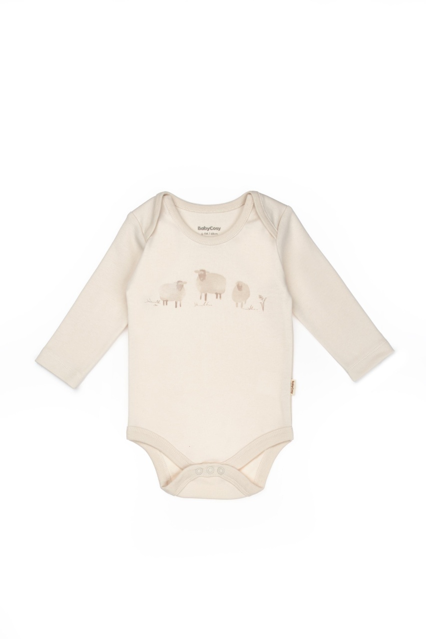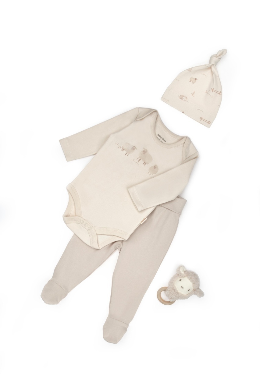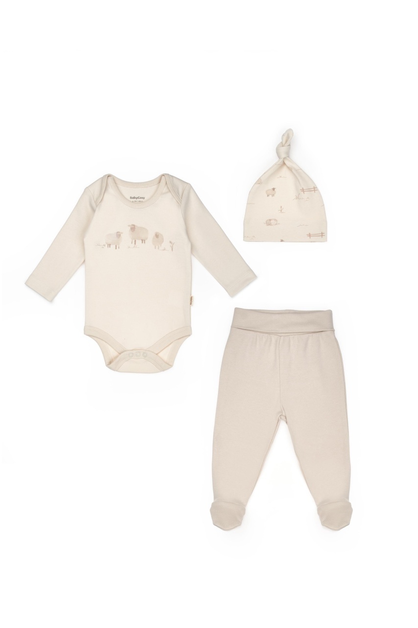 Acest set adorabil de la BabyCosy Organic Wear este format din căciuliță cu imprimeu cu animăluțe, body cu mânecă lungă decorat cu oite pe piept și pantalonași cu botoșei, oferind bebelușului confort, căldură și libertate de mișcare pe tot parcursul zilei.