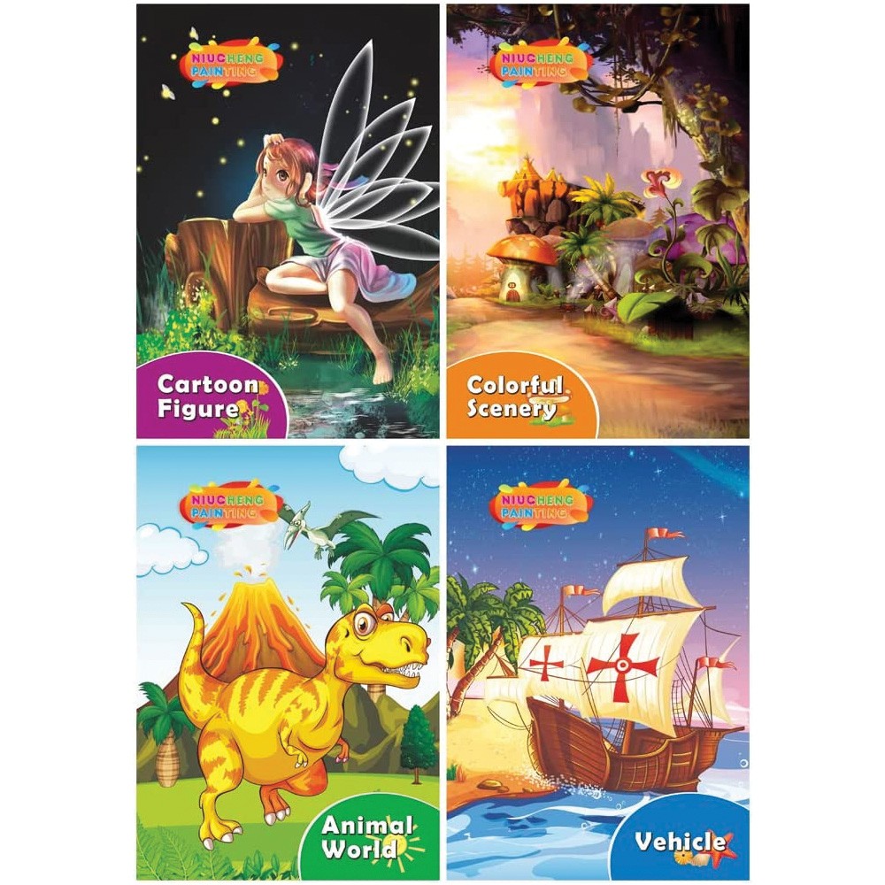 Set 4 caiete de colorat razuibile cu diverse teme si cu 12 culori, rechizite scolare, multicolor, 19 cm X 13 cm