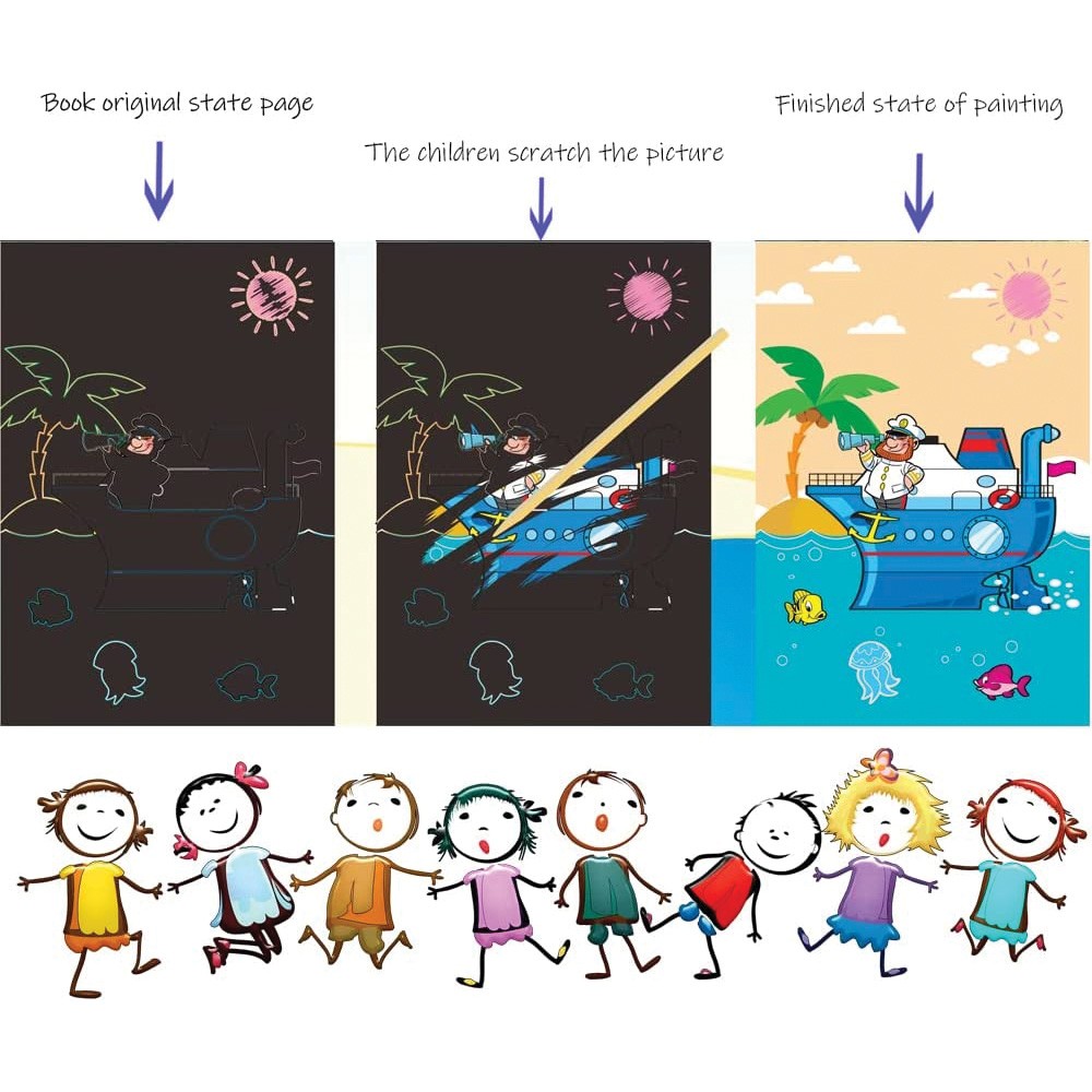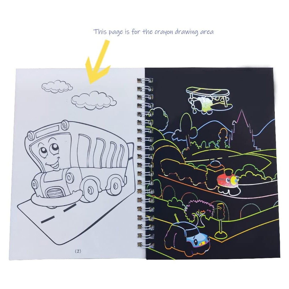 Pe una dintre pagini se poate razui materialul negru pentru a descoperi cel mic imaginea iar pe verso se poate colora lasand libera imaginatia.