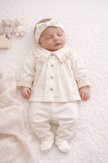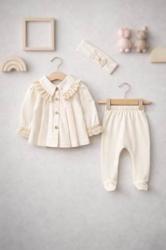 Acest produs Set Baby Aura 0–3 luni, 3 piese cu tiv din dantelă la guler este model B2504