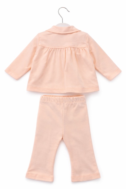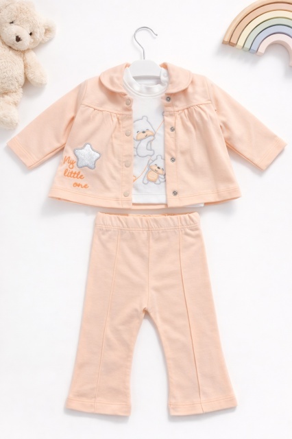 Acest produs Set bebe fete 3 piese piersica jacheta bluza cu imprimeu si pantaloni este model TRAM2202-11