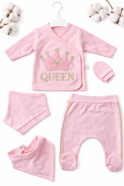 Acest produs Set bebe fetita 5 piese roz queen bumbac bluza pantaloni caciula bavetica elegant este model TRPB0216