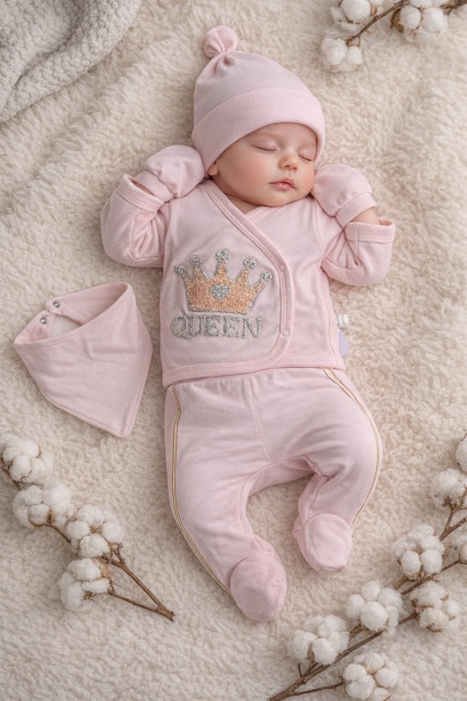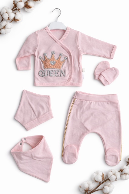 Acest produs Set bebe fetita 5 piese roz queen bumbac bluza petrecuta pantaloni caciula bavetica este model TRPB0217