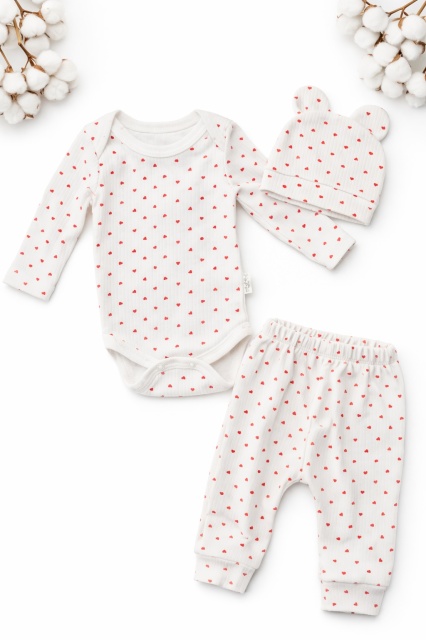 Acest produs Set bebelus 3 piese body pantaloni caciula bumbac ribat cu inimioare este model TRPB0159