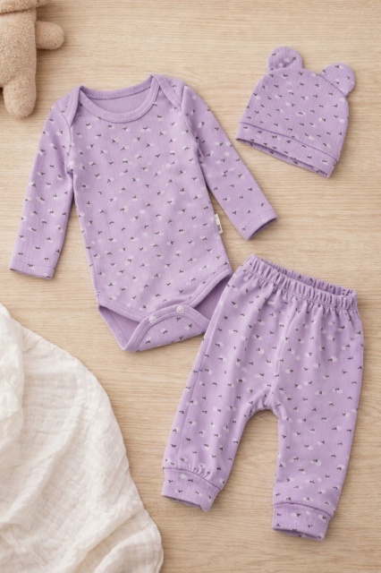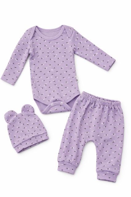 Acest produs Set bebelus fetita 3 piese body pantaloni caciula bumbac ribat lila este model TRPB0160