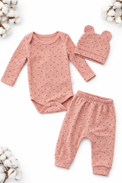Acest produs Set bebelus fetita 3 piese body pantaloni caciula bumbac ribat roz pudra este model TRPB0161