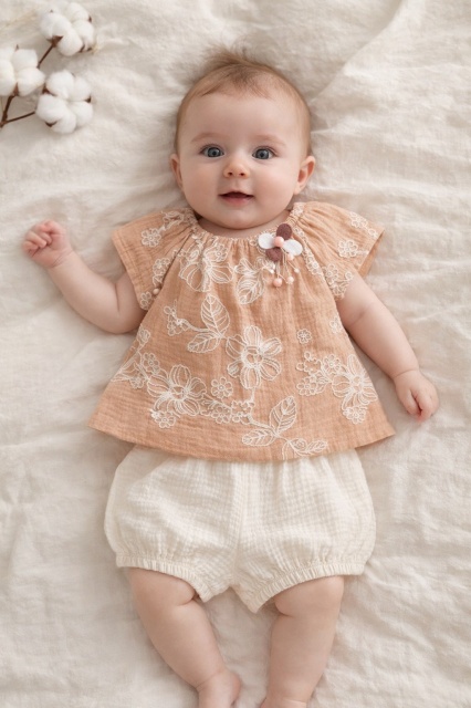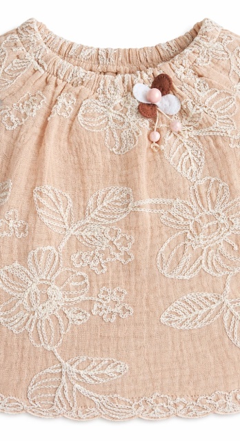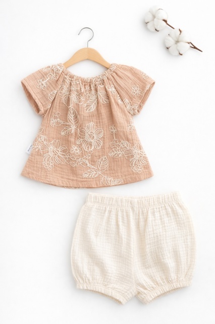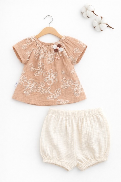 Acest produs Set bebelusi fetita bluza maro cu broderie florala pantaloni scurti crem vara elegant este model TRPB0225