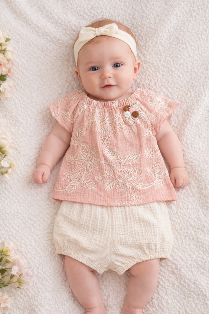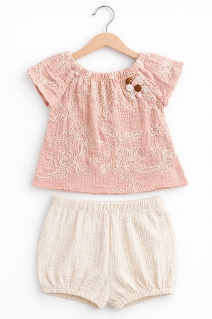 Acest produs Set bebelusi fetita bluza roz cu broderie florala pantaloni scurti crem vara premium este model TRPB0224