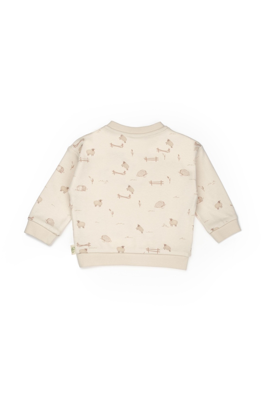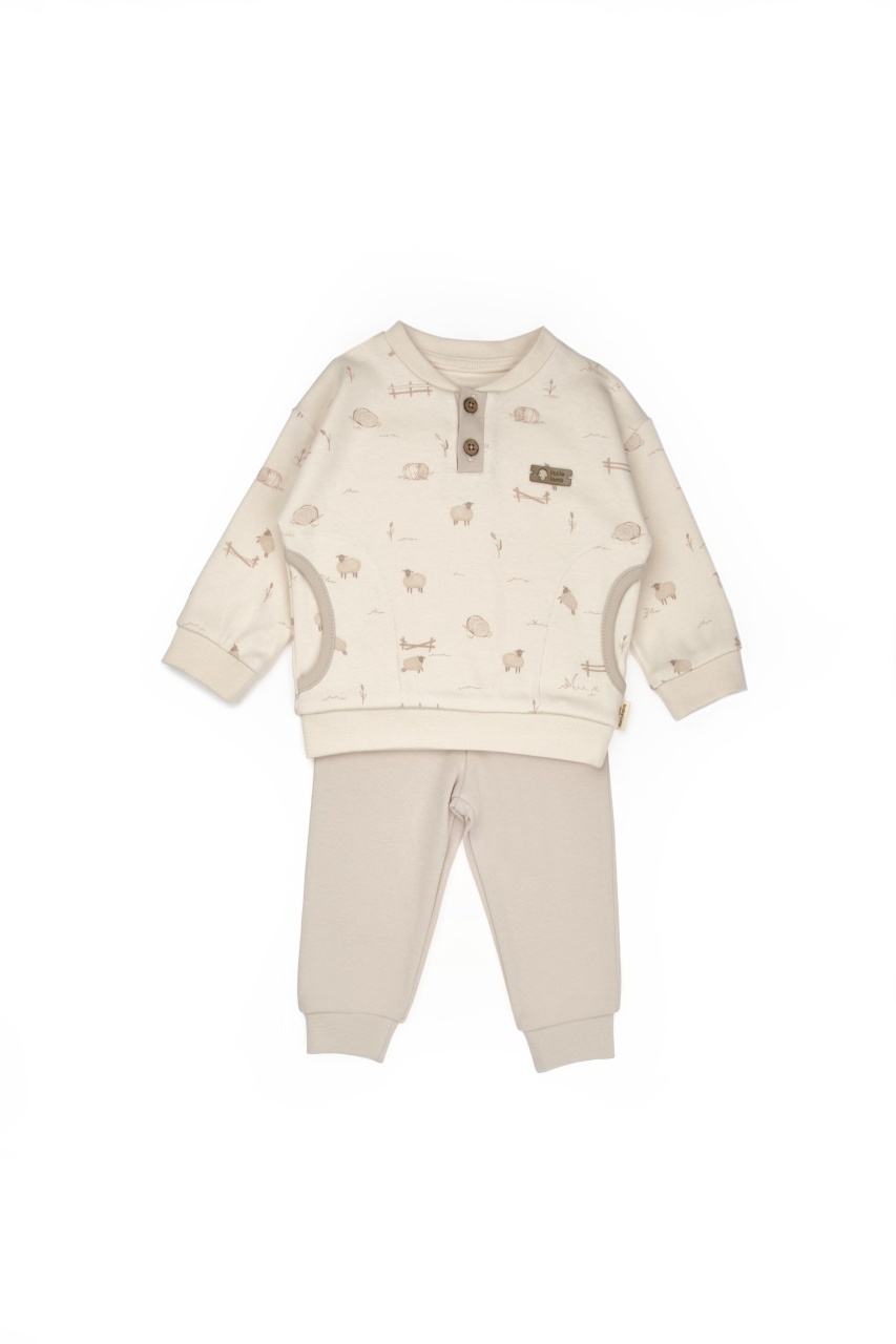 Designul delicat, în tonuri neutre, este completat de imprimeuri cu oițe, realizate cu vopseluri pe bază de apă, sigure pentru pielea sensibilă. Croiala lejeră permite libertate de mișcare, iar talia elastică a pantalonilor oferă o potrivire confortabilă fără a strânge.