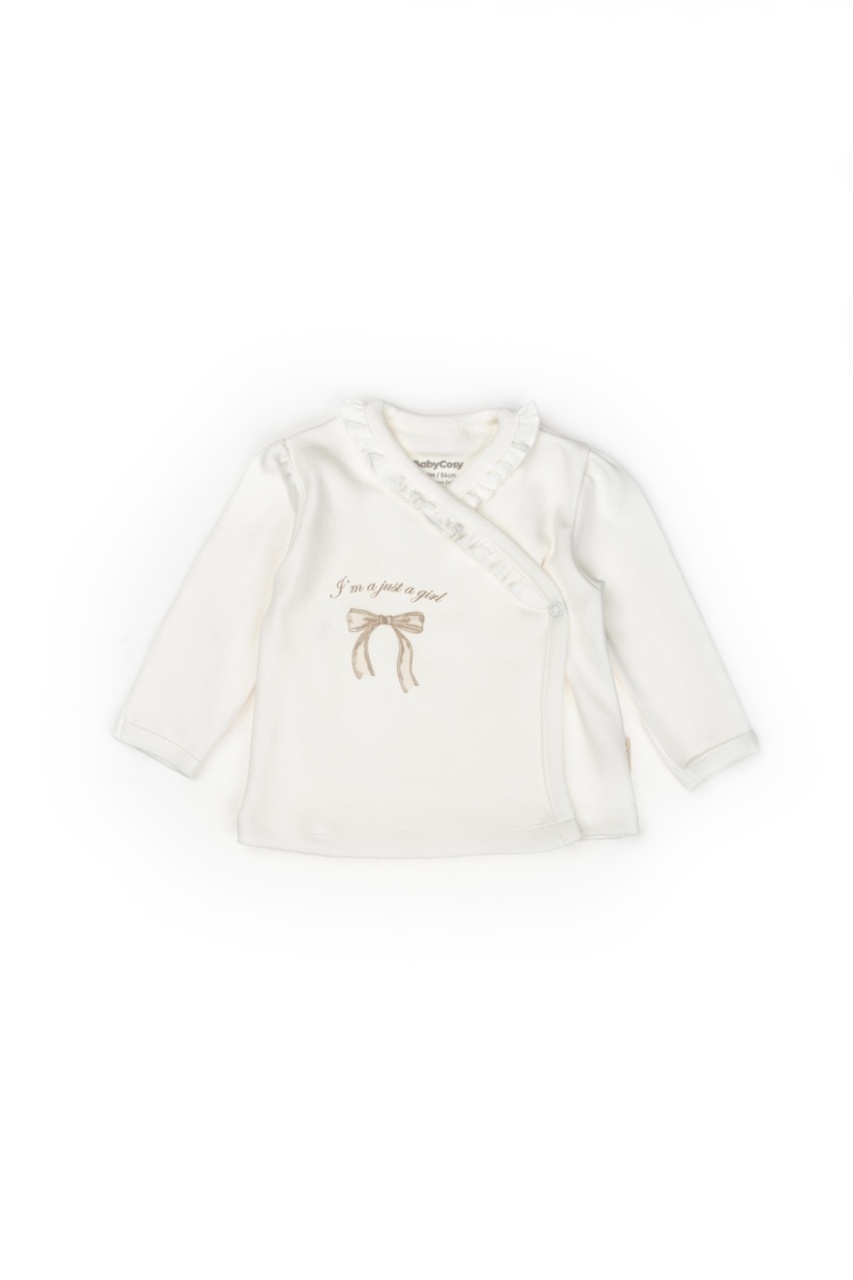 - Bluzita cu maneca lunga, cu inchidere pe lateral cu capse ce nu contin nichel si foarte usor pentru a fi purtat de un bebe nou nascut