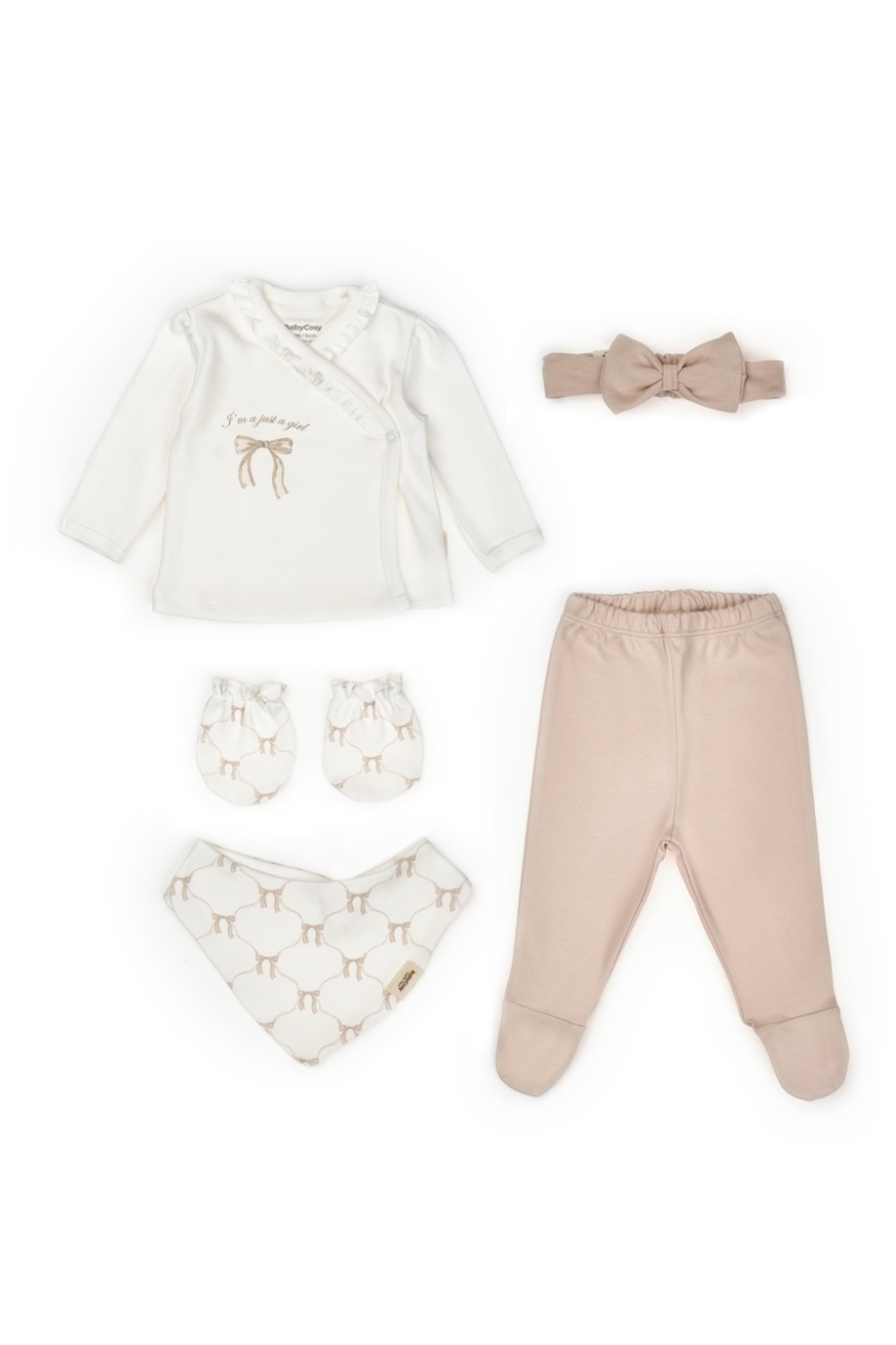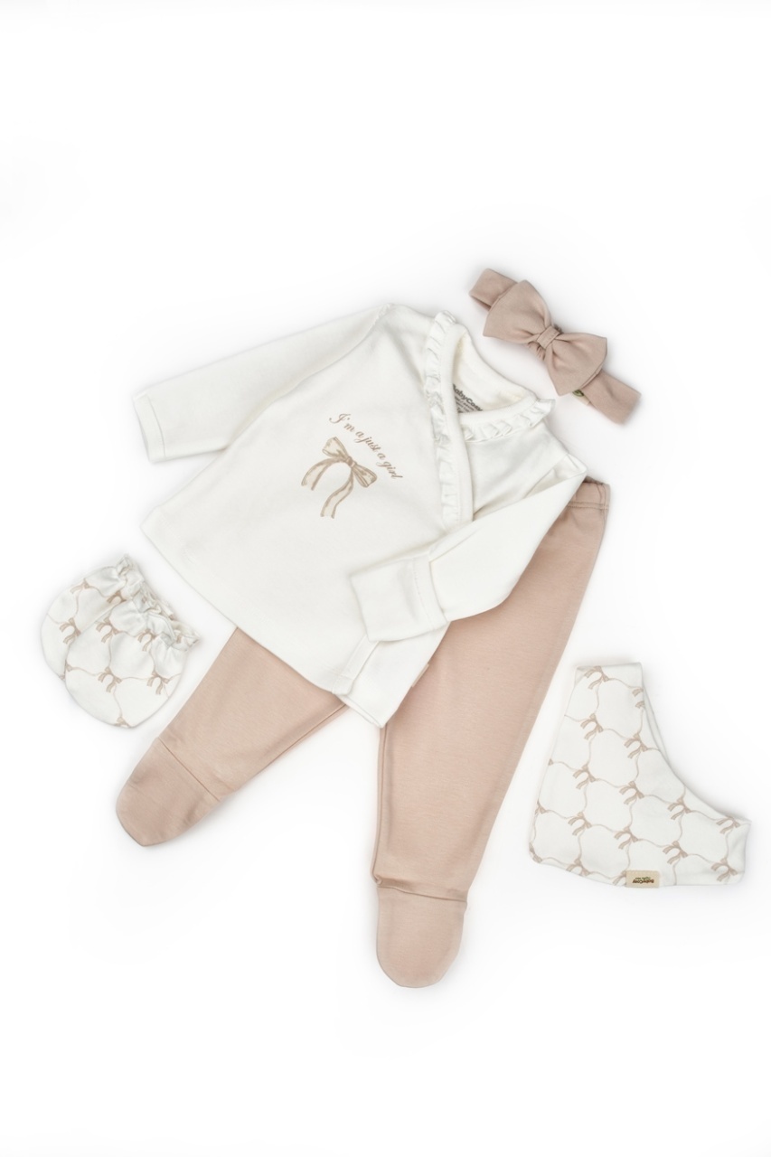 Acest set adorabil pentru nou-născut de la BabyCosy Organic Wear este alegerea perfectă pentru primele luni de viață, oferind confort, protecție și siguranță pentru pielea delicată a bebelușului. Setul conține bluză tip kimono cu capse laterale, pantalonași cu botoșei, bentita cu fundita, mânuși anti-zgâriere și bavetă, toate în nuanțe naturale și decorate cu imprimeuri fine cu oițe.