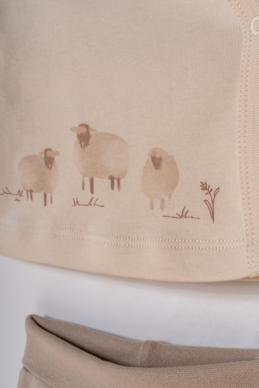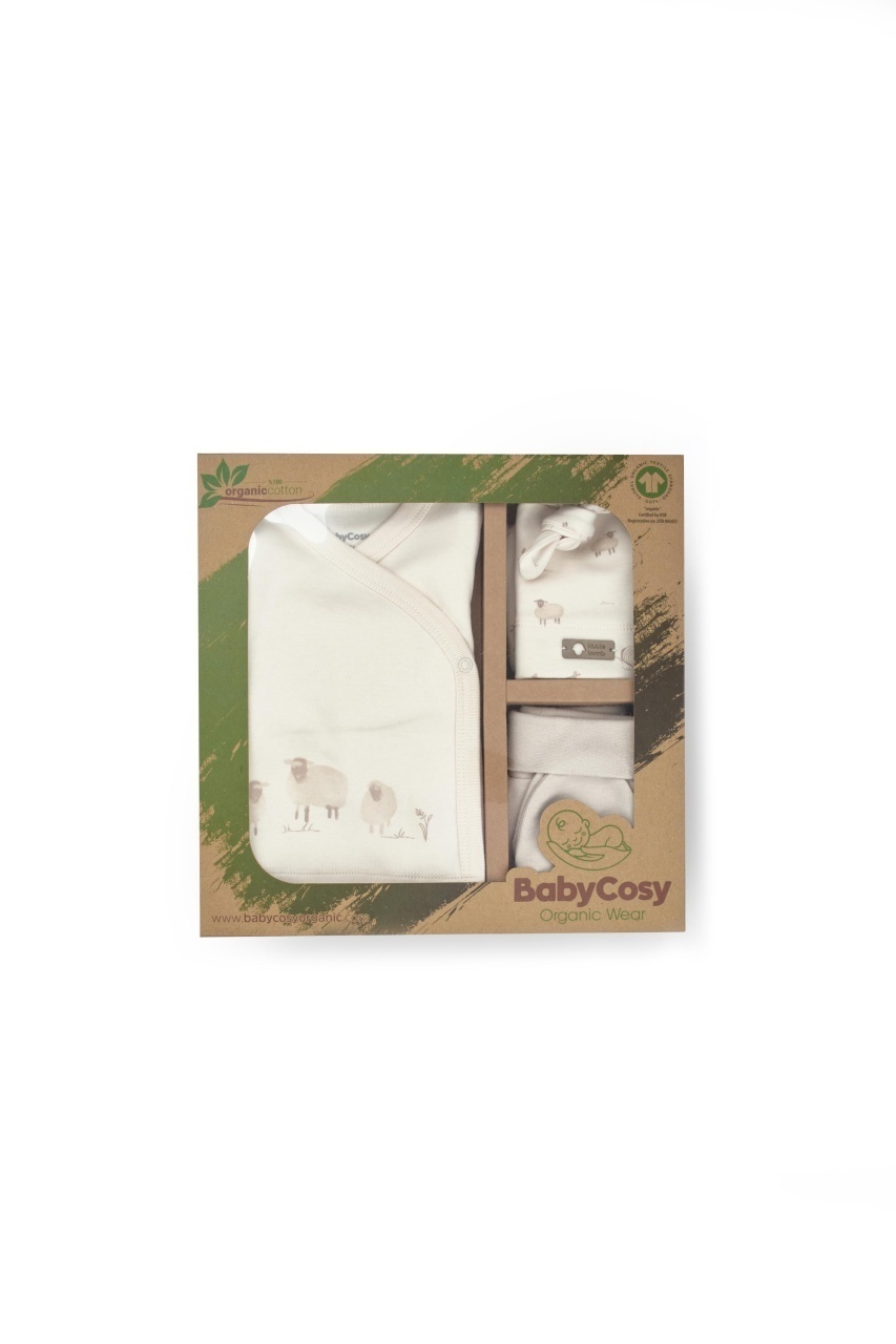 Acest set adorabil pentru nou-născut de la BabyCosy Organic Wear este alegerea perfectă pentru primele luni de viață, oferind confort, protecție și siguranță pentru pielea delicată a bebelușului. Setul conține bluză tip kimono cu capse laterale, pantalonași cu botoșei, căciuliță, mânuși anti-zgâriere și bavetă, toate în nuanțe naturale și decorate cu imprimeuri fine cu oițe.