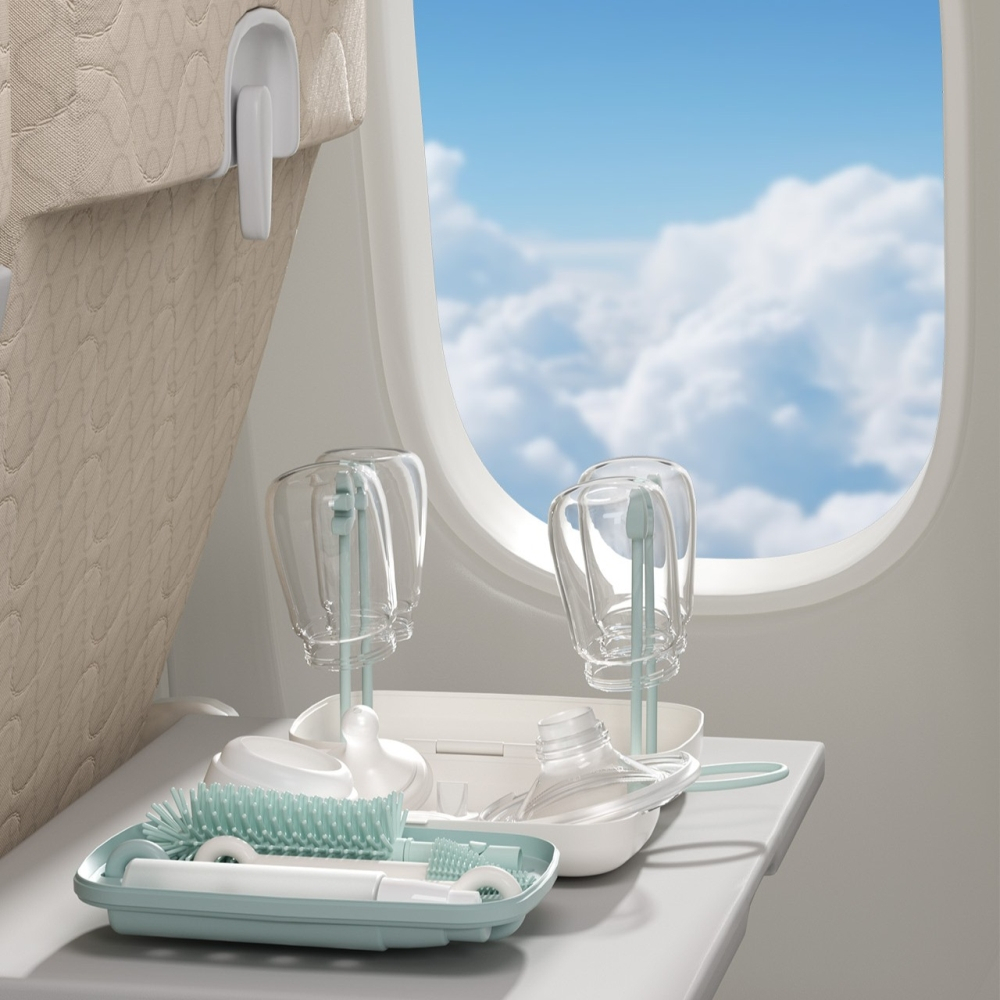 - Kit 7 in 1 pentru rutina zilnica - include perie din silicon pentru biberon, perie pentru tetina, perie pentru pai, dozator de sapun, suport de uscare pliabil, cutie de depozitare si o geanta de transport.