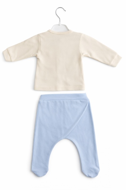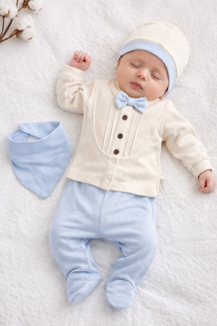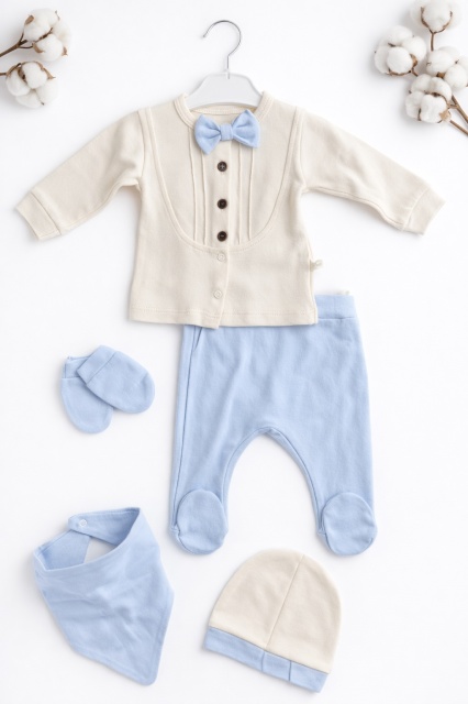 Acest produs Set nou nascut baiat 5 piese elegant bumbac ivory bleu bluza papion pantaloni caciula este model TRPB0203