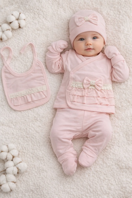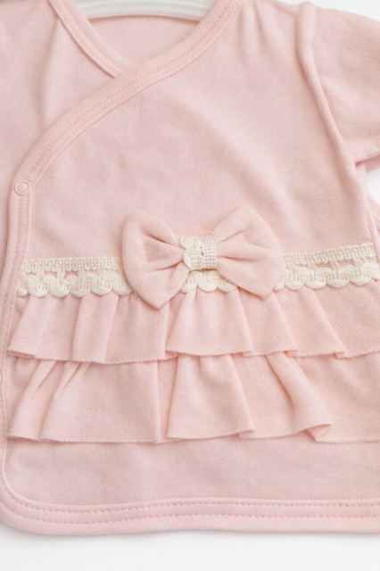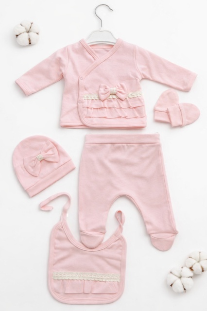 Acest produs Set nou nascut fetita 5 piese roz bumbac bluza petrecuta pantaloni caciula bavetica este model TRPB0218