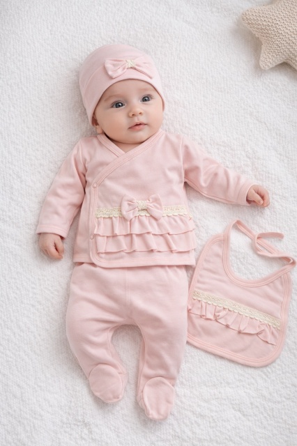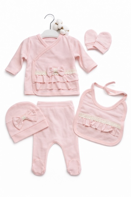 Acest produs Set nou nascut fetita roz 5 piese bumbac elegant bluza pantaloni caciula baveta este model TRPB0207