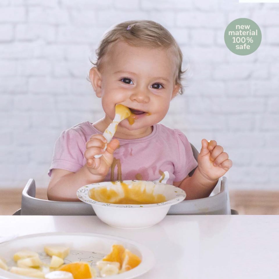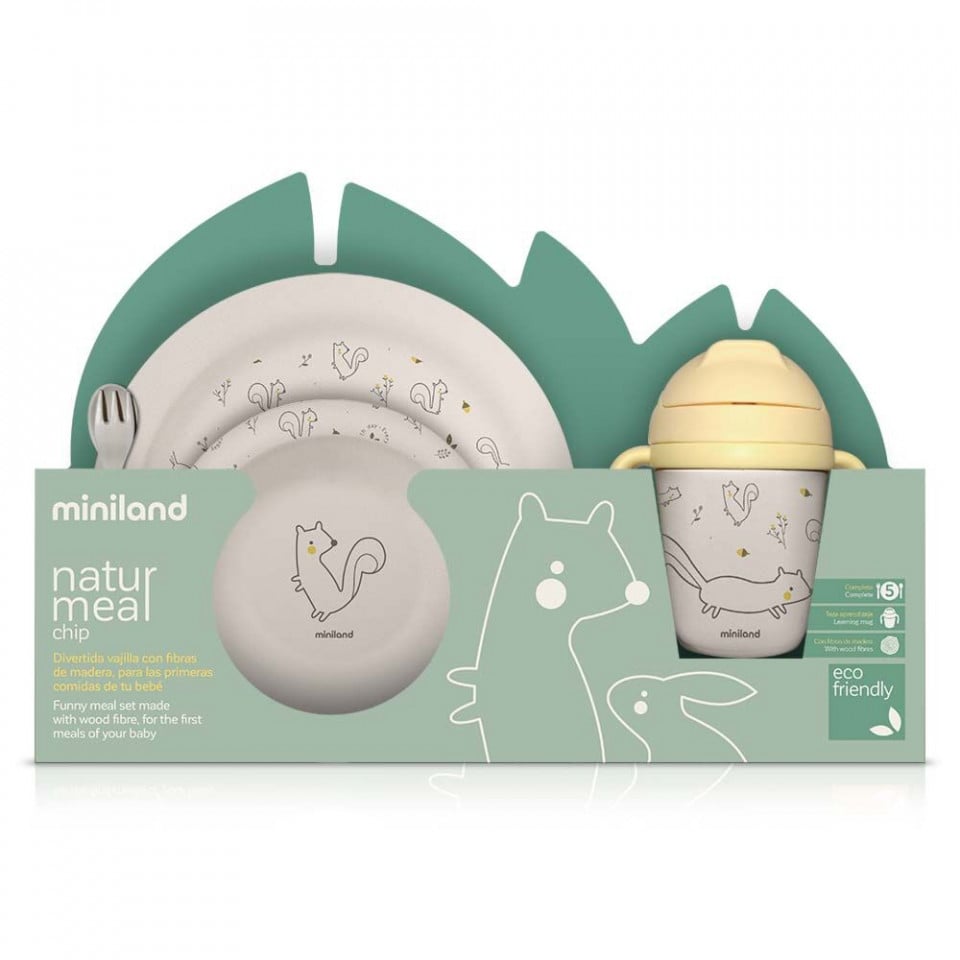 Este un set format din cinci piese , o farfurie, un bol ,tacamuri si cana realizate din fibre de lemn,care fac parte din noua colectie Miniland,urmand tendinta pentru un ecositem durabil.   Datorită dimensiunilor mici, furculita și lingura îi vor ajuta pe cei mici să învețe să mănânce în mod autonom. În plus, cana este alegerea perfectă pentru primele incercari ale copilului, deoarece mânerele sale laterale o fac foarte confortabila și ușor de apucat cu mâinile celor mici.   Aceasta noua linie include produse realizate din materiale organice si biodegradabile(din fibre de lemn.)ideale pentru utilizarea lor de catre parinti  si copii si asigurand o intrebuintare cat mai naturala .   Fara BPA .   Toate piesele din acest set pot fii spalate si la masini automate de vase.   Recomandat de la  6 luni+
