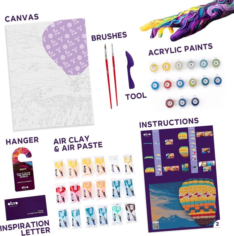Set pictura si modelare 3D cu argila usoara, 30*40 cm - Hot Air Balloon flight Lasa-ti imaginatia sa zboare! Cu ajutorul acestui kit, copilul tau isi va dezvolta motricitatea degetelor si a mainilor, exersandu-si coordonarea ochi-mana, atentia si creativ