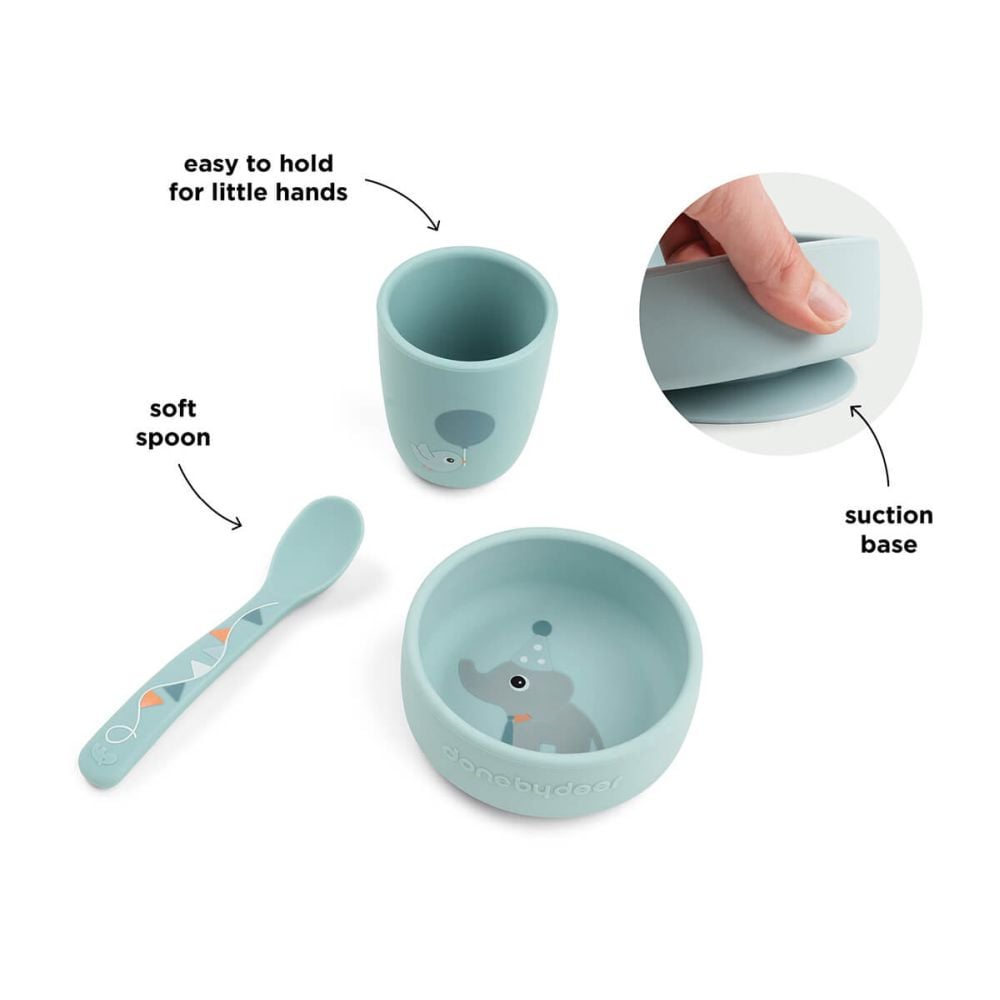 'Toate piesele sunt realizate din silicon alimentar 100%, un material flexibil, rezistent si potrivit pentru contactul frecvent cu alimentele. Varianta Celebration Blue are un aspect calm si prietenos, cu detalii grafice care adauga un plus de farmec mesei copilului. Set prima masa cu ventuza Done by Deer Celebration Blue combina foarte bine functionalitatea cu un design simplu si placut.