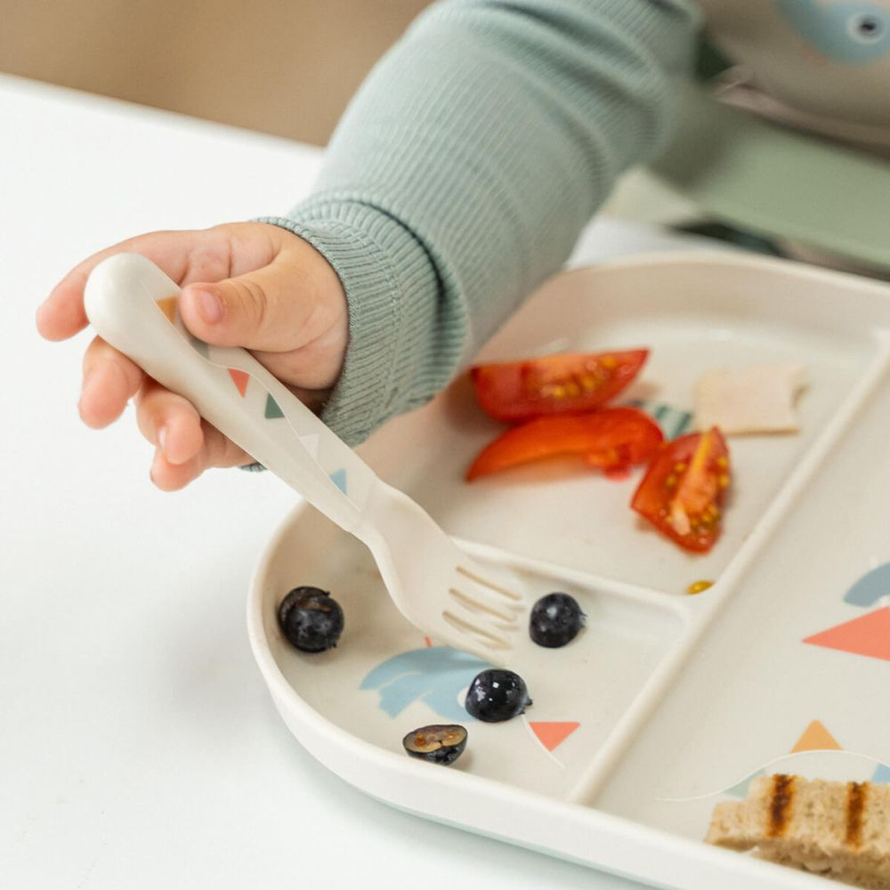 'Tacamurile sunt dimensionate pentru o prindere mai usoara si pentru utilizare confortabila de catre copil. Marginile moi si rotunjite contribuie la o experienta mai blanda in timpul mesei, iar forma lor ajuta copilul sa exerseze miscarile de baza necesare pentru hranirea independenta. Set tacamuri Done by Deer Celebration Sand este o alegere buna pentru rutina zilnica, atat acasa, cat si in deplasare.