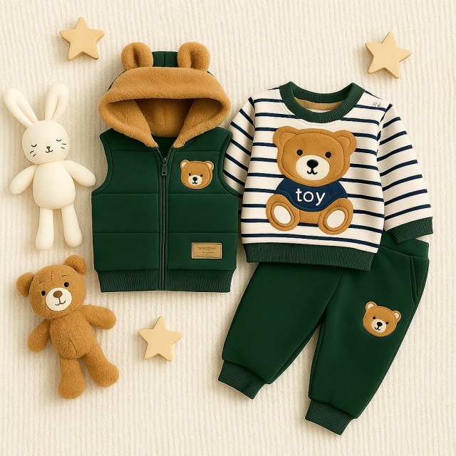 Acest produs Set verde bebelusi cu ursulet cu vesta si hanorac – 3 piese este model TRMBK6080-1