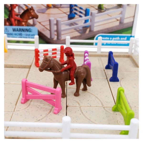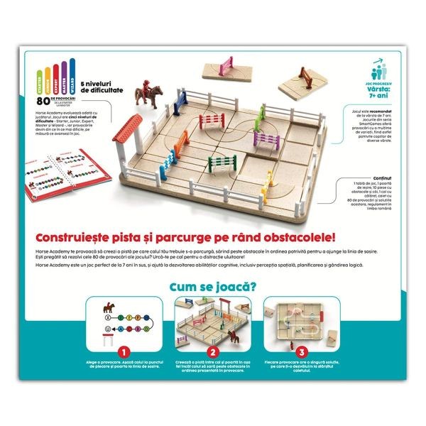 Horse Academy este un joc pentru copii din seria Smart Games, realizat cu elemente de inalta calitate si construit in jurul unui concept captivant: trasee de echitatie cu obstacole, gandite ca puzzle logic. Jocul include 80 de provocari logice cu dificultati crescatoare, recomandat pentru varstele 7+. In fiecare provocare, pornesti de la spatiul de start cu calul si calaretul si trebuie sa construiesti corect traseul pana la finish, folosind piesele indicate si urmand literele de pe acestea. Obstacolele trebuie plasate astfel incat sa fie sarite in aceeasi ordine ca in provocare, iar uneori vei reveni peste acelasi obstacol de mai multe ori. Rezultatul este un puzzle dinamic care combina logica, planificarea si atentia la detalii. Continut: ✔ 1 tabla de joc