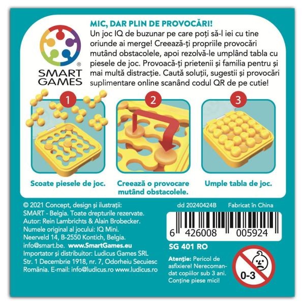 IQ Mini este un joc de logica compact si portabil din seria Smart Games, creat pentru provocari rapide si inteligente oriunde te-ai afla. Jocul vine intr-o cutie rezistenta cu capac transparent si te invita sa iti creezi propriile provocari prin glisarea piesei tip bariera, apoi completarea spatiului ramas cu piesele puzzle. Alege-ti culoarea preferata si provoaca-te pe tine, prietenii sau familia. Pentru si mai multa distractie, poti accesa provocari suplimentare, sugestii si toate solutiile direct din aplicatie, prin scanarea codului QR de pe cutie. Continut: ✔ 1 tabla de joc super compacta, cu capac transparent