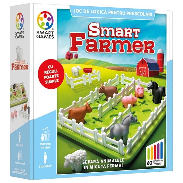 Smart Farmer este un joc pentru copii din seria Smart Games, realizat cu elemente de inalta calitate si o tematica simpatica de ferma, usor de inteles pentru cei mici. Jocul include 60 de provocari logice cu dificultati crescatoare, recomandat pentru varstele 4+. In fiecare provocare, animalele au nevoie de ordine: fermierul trebuie sa le separe in pajisti diferite, dar are la dispozitie doar trei garduri simple pentru a imparti campul. Provocarea este sa asezi gardurile inteligent astfel incat vacile, caii, oile si porcii sa aiba fiecare spatiul lor, iar in acelasi timp toti sa aiba acces la apa de baut. Un puzzle excelent pentru logica, planificare si gandire spatiala. Continut: ✔ 1 tabla de joc cu 4 garduri fixe