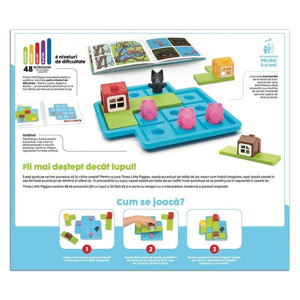 Three Little Piggies – Deluxe este un joc pentru copii din seria Smart Games, realizat cu elemente de inalta calitate si inspirat din celebra poveste a celor trei purcelusi. Jocul include 48 de provocari logice cu dificultati crescatoare, recomandat pentru varstele 3+, fiind conceput special pentru a introduce copiii mici in lumea jocurilor de logica prin joaca si poveste. Provocarile ii invita pe cei mici sa ajute purcelusii sa-si construiasca casele, sa se joace afara sau sa se adaposteasca in siguranta atunci cand apare lupul. Piesele mari sunt usor de manevrat, iar copiii vor fi fascinati de modul in care purcelusii se potrivesc in case si pot fi vazuti prin ferestre. Continut: ✔ 1 tabla de joc