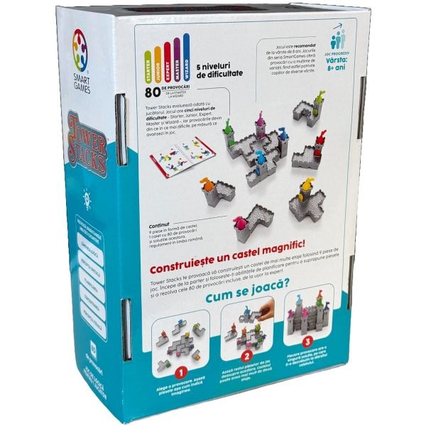 Tower Stacks este un joc pentru copii din seria Smart Games, realizat cu elemente de inalta calitate si gandit pentru pasionatii de puzzle-uri 3D si constructii verticale. Jocul include 80 de provocari logice cu dificultati crescatoare, recomandat pentru varstele 8+. Provocarea este sa construiesti un castel vertical pornind de la sol, folosind cele 9 piese speciale in forma de turn. Fiecare provocare solicita planificare atenta, gandire spatiala si rabdare, pe masura ce piesele trebuie stivuite corect pentru a obtine structura finala ceruta. Continut: ✔ 9 piese puzzle in forma de castel