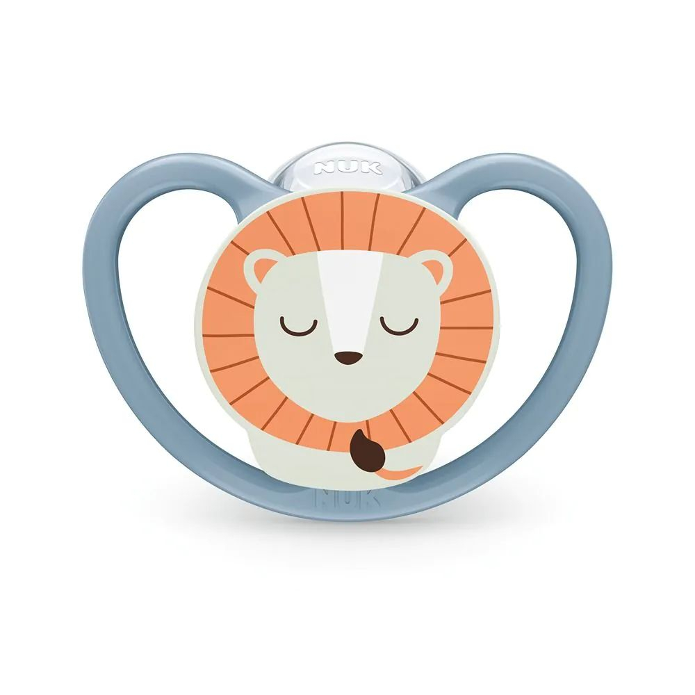 'Suzeta Nuk Space Night Silicon 6-18 luni, Set 2 Bucati, Leu este gandita pentru bebelusi care folosesc suzeta si pe timpul noptii, oferind un plus de confort si usurinta in gasirea ei. Butonul cu efect luminos ajuta la localizarea rapida in intuneric, iar designul Space este creat pentru pielea sensibila, cu aerisire generoasa.
