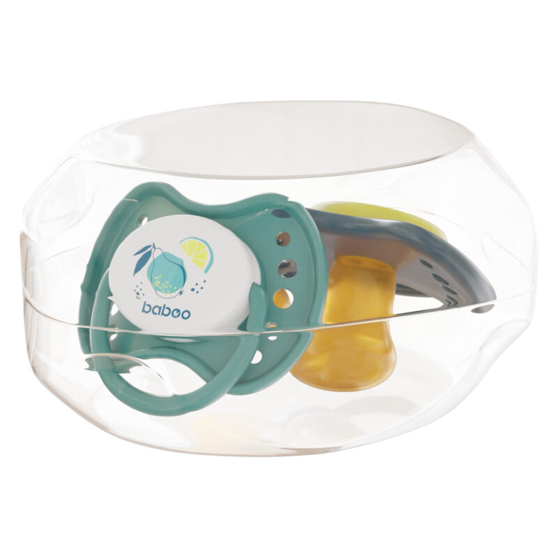 Suzeta ortodontică Baboo® Calmy din latex susține dezvoltarea orală naturală cu o tetină moale din latex și un scut respirabil. Include o capsulă igienică pentru depozitare și sterilizare.