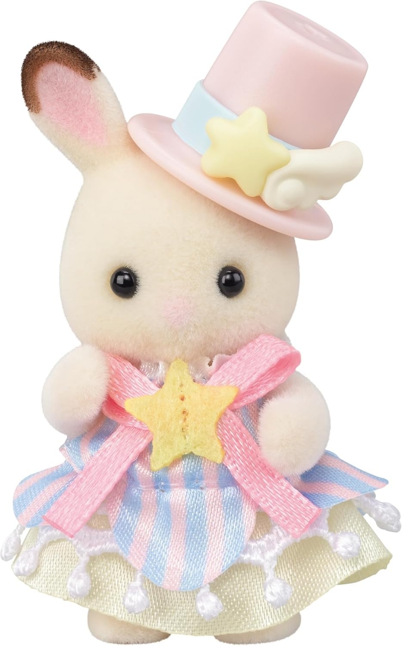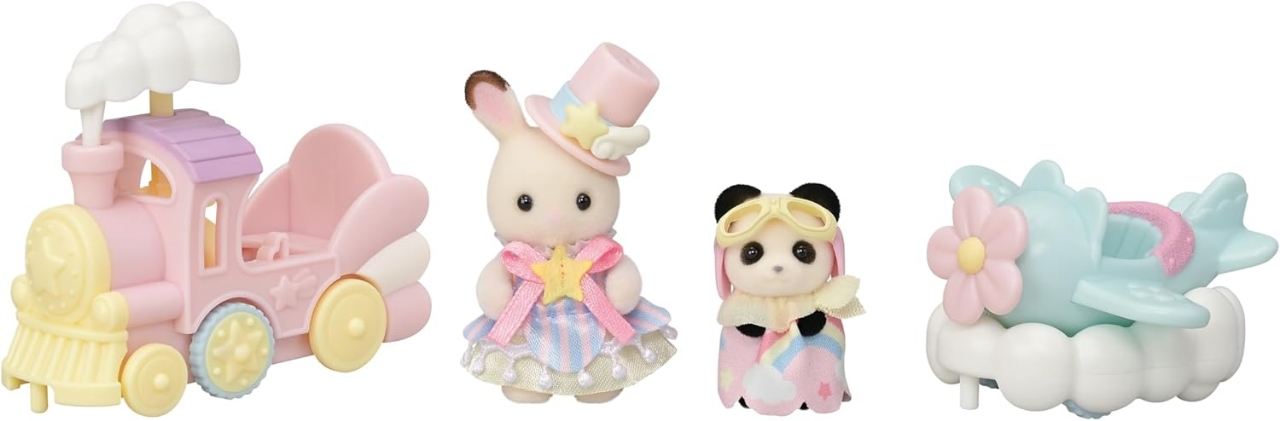 Un set superb de la Sylvanian Families, avion si trenulet de la parcul de distractii, impreuna cu iepurasul de ciocolata si bebelusul Pookie Panda. Numele bebelușului Iepuraș de Ciocolată este Crème, iar numele bebelușului Pookie Panda este Erin.